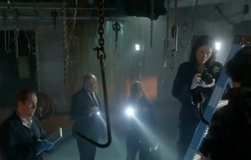 In the slaughterhouse, Finn and Sara recreate the crime. They determine that one killer could've acted alone, jabbing a meat hook into the victim's back, hoisting him up in the air, and slicing his torso. When they luminol the place, they find the floors are covered in blood, likely from all the animals slaughtered over the years. Sara sprays luminol in the adjacent hallway and discovers one set of footprints heading down a dead end. When she searches a gap in the brick wall, she finds the bloody knife used to kill Doug.