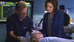 Sid IDs the second victim as Roni Parker—the sister of Chief Ted Carver. Mac tells Carver of his sister’s fate, and the police chief tells Mac that he assumed Roni had just disappeared again, something she had a habit of doing. Roni disappeared one day, and Carver and his wife took her kids in. Mac vows to find Roni’s killer. Flack finds that Sprouse Funeral Home is near Central Park, not far from the location where Isabel ran into the park. Flack, Jo, Lindsay and Hawkes go to the funeral home and find an eerie setup in the basement, complete with nitrous oxide tanks and a mortuary table. Jo finds blonde hair on the table, while Lindsay discovers vintage dresses and a drawer full of women’s purses. The team realizes the owner of the funeral parlor was using nitrous oxide to incapacitate women and control them once they were unconscious, redressing and putting makeup on them. Back at the lab, Danny tells Mac that Roni Parker’s credit cards are still being used, prompting Mac, joined by Chief Carver, to visit the apartment rented by the person using the cards. When they enter the apartment, no one is there—but a DVD still playing indicates someone was just at the apartment, leaving Mac to suspect the woman knew they were coming. Gordon Sprouse is arrested for Isabel’s murder, but the creepy funeral home proprietor tells Flack and Hawkes that he drugs girls and plays with them—but doesn’t murder them. He says Isabel woke up and ran off. Jo culls through the purses and contacts the women Gordon drugged and dressed up, while Mac is becoming suspicious of Chief Carver…