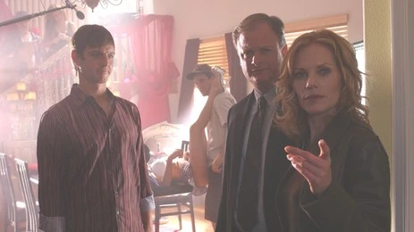 Catherine, Sara, Warrick, and Det. Sulik visit the hotel where the filming took place. The CSIs each take a room, with Sara finding the exact room the murder took place in. All of the furniture has been removed from the room. Catherine notices the wall has recently been painted, and Warrick runs a UV light over it to find the presence of arterial spray.