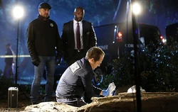 The CSIs take a trip with Carlo to the vault, which is full of classic cars. While there, Carlo is confronted by his brother, Aron, who's under the impression that Finn and Sara are buyers. Finn takes a look around and finds the 1938 Packard in the mechanic's bay. The car has a busted headlamp, while the nearby chrome bath shows signs of a recent struggle. She and Sara follow a trail of chrome drops to an empty parking spot in the warehouse. The Derosa brothers are soon made aware that their priceless 1976 Cadillac is missing, and it's the most valuable car in the collection.