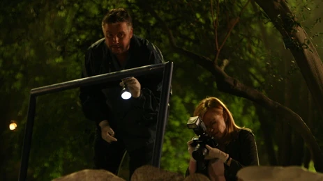 While curious onlookers gather behind the yellow tape, Grissom and Nick sift through the dirt and shovel up the maggots. Nick observes that there's no tissue and is informed that maggots can digest a body in just a few days. He also has a hard time believing that nobody would notice a corpse lying in the grass. The pieces of bones they're recovering are all uniform, and they're the same shape and size as the wood chips in the dirt. Grissom comes to a conclusion and is able to find a mulching machine being used on campus. He swabs the inside of the machine and finds evidence of human blood.